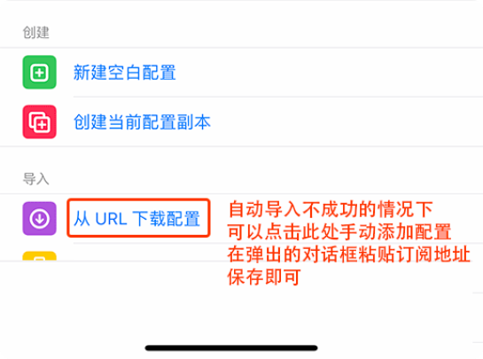 配置列表 向下滑动,找到 导入 – 从URL下载配置,然后将 复制的订阅地址 粘贴到弹出的输入栏中,点击“好的”按钮后客户端会自动下载配置文件。